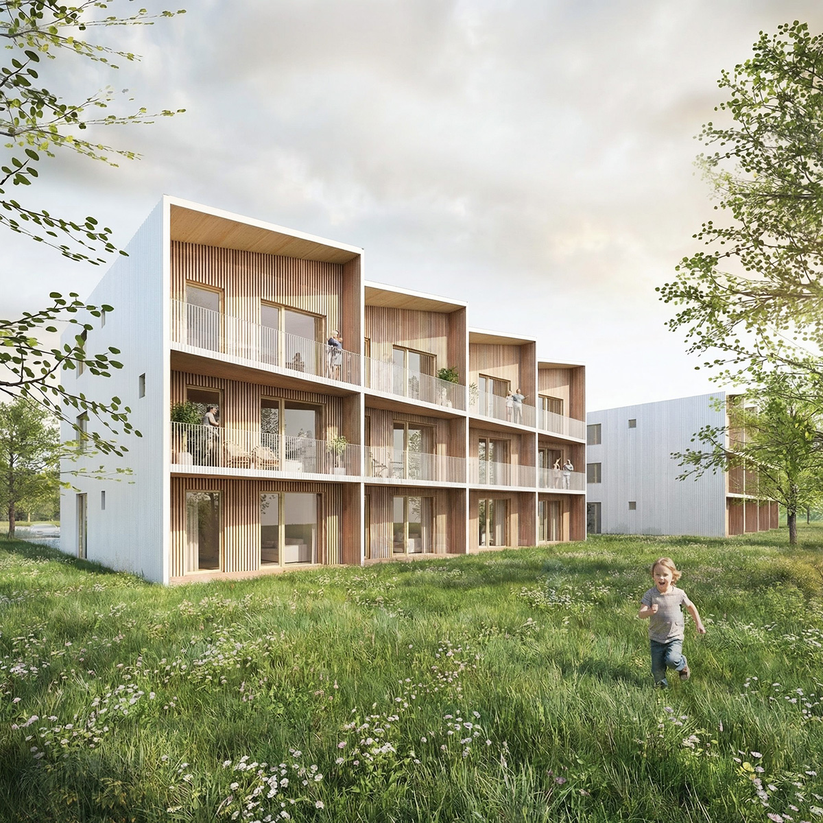 Objekty jsou navržené jako třípodlažní, na každém patře jsou čtyři apartmány. V každém objektu je tedy 12 apartmánů ve velikosti od 33 do 52m2. Apartmánový dům je navržený jako dřevostavba kombinovaná z CLT panelů a rámové konstrukce. Stropy jsou navrženy z CLT panelů s přiznanou spodní pohledovou stranou. Mezibytové stěny předpokládáme z akusticky dostatečně odolných systémů bez pohledového požadavku. Příčky v rámci jednotlivých apartmánů jsou navrženy z CLT panelů a mají pohledovost naznačenou v půdorysech.