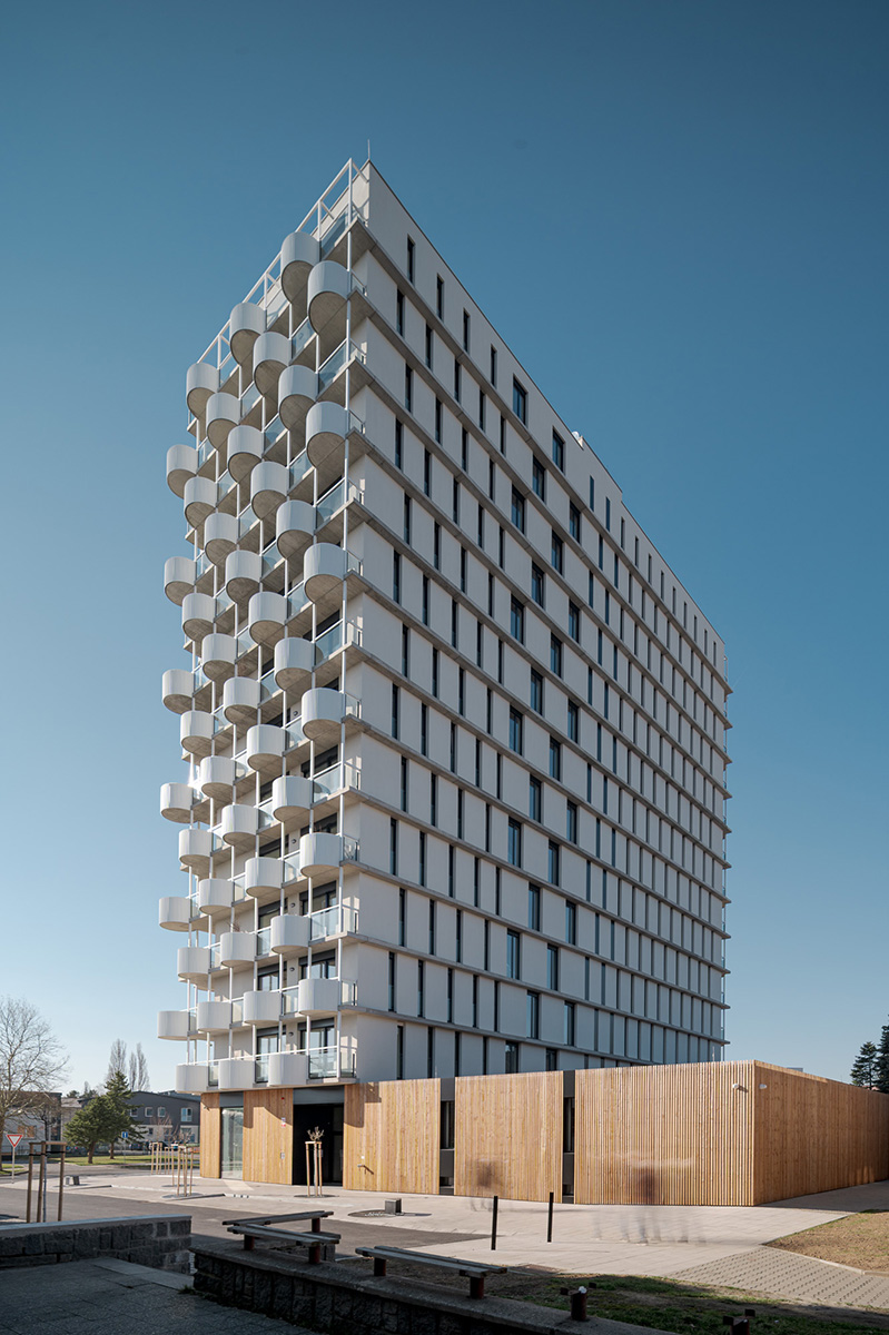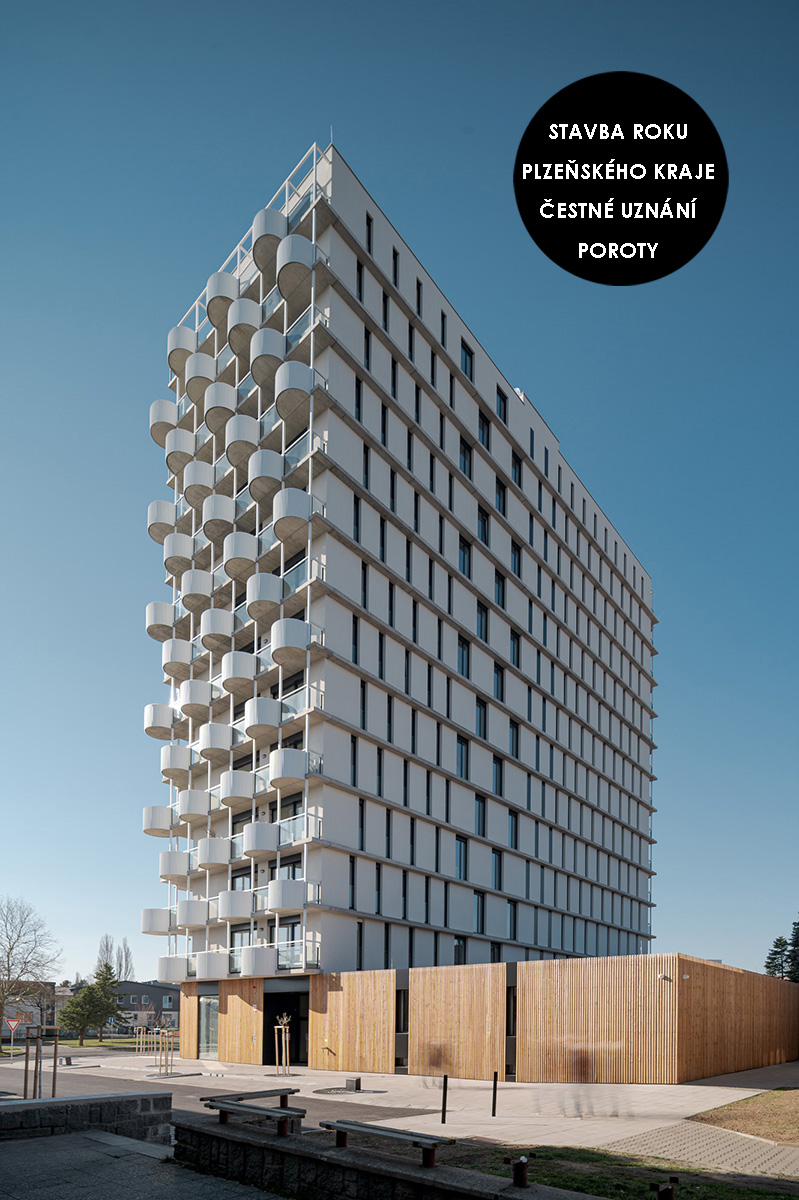 Dům se nachází v Plzni na západním okraji sídliště Bory v bezprostřední blízkosti Borského parku. Západní okraj sídliště je lemovaný výškovými domy. Hmotovým řešením domu doplňujeme tuto původní strukturu, ale v řešení samotného bytového domu jsme se snažili reagovat na obecné nedostatky sídlišť jako je nedostatek parkování, monofunkčnost, absence soukromé zeleně, nedostatek soukromých exteriérových prostorů a absence kvalitních veřejných prostorů. Řešený objekt má 14 pater a tvoří ho horizontální část s vnitřním parkováním a nebytovými prostory, které navazují na zpevněné prostranství před domem a vertikální část, kde je 13 pater bytů různé velikosti. Hlavní orientace bytů je na západ, a to jednak kvůli oslunění a také kvůli výhledu na Borský park a dále za hranice města. Západní, severní a jižní fasádu obíhají průběžné lodžie, které poskytují dostatek soukromého venkovního prostoru. Na průběžné lodžie navazují půlkruhové květináče na zeleň, které tvoří zároveň výraznou strukturu fasády. Květináče mají i funkci zábradlí, závlaha květináčů je zajištěna rozvodem vody v madle zábradlí. Fasáda bytových pater je řešena drážkovanou omítkou. Fasáda horizontální části je obložena dřevem. Interiér společných prostor je řešen v kombinaci přiznaných betonových povrchu a výrazných barev jednotlivých pater. Součástí řešení byl i návrh předprostoru z betonové dlažby s pravidelným rastrem kruhových otvorů pro stromy, který navazuje na koncepci řešení fasády se zelení.