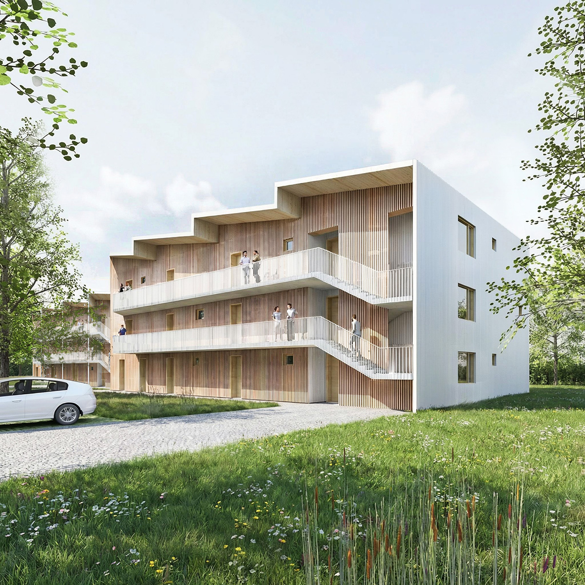 Nosná konstrukce z CLT panelů, venkovní schodiště, pavlač, přiznané dřevo na lodžiích i v interiéru ............ i takto může vypadat současný apartmánový či bytový dům. Děkuji za velmi zajímavé zadání, které reaguje na současné technologie a trendy ve stavebnictví i architektuře a už teď se těším na pokračování tohoto projektu.